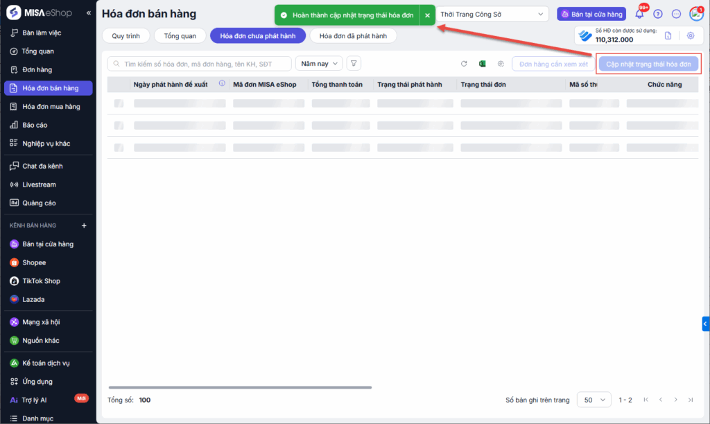 Sau khi hoàn tất, nhấn Phát hành, hệ thống sẽ phát hành hóa đơn hàng loạt và thông báo khi phát hành thành công.