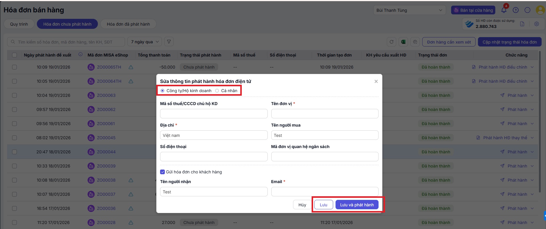 2.2 Phát hành hóa đơn thủ công trong danh sách hóa đơn chưa phát hành