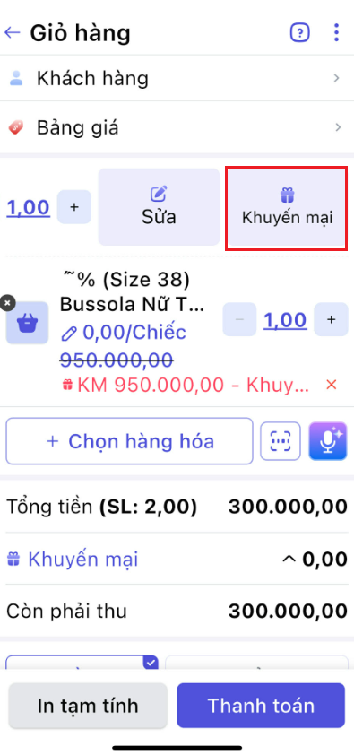 Trên giao diện giỏ hàng, anh/chị chọn hàng hóa cần được giảm giá và gạt sang trái. Chọn mục khuyến mại để nhập thông tin khuyến mại: