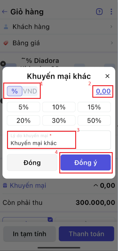 Bước 2: Nhập thông tin giảm giá và lý do khuyến mại