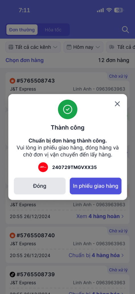 Sau khi chuẩn bị thành công, hệ thống sẽ hiển thị mã vận đơn. Anh chị cần in phiếu giao hàng, đóng gói và chờ đơn vị vận chuyển đến lấy.