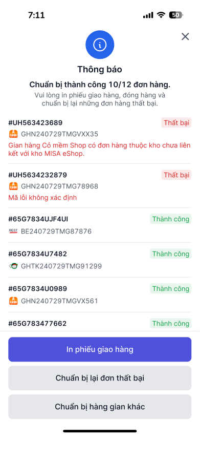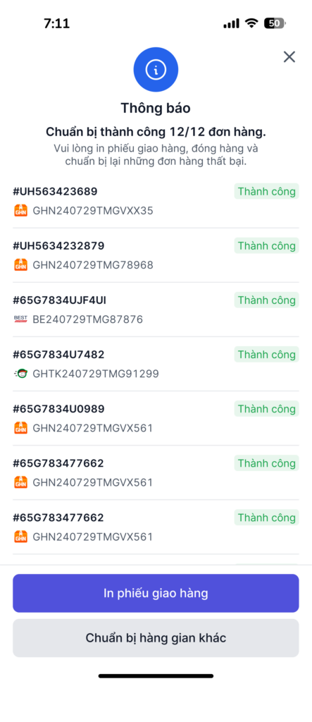 Phần mềm sẽ hiển thị thông báo số lượng đơn hàng chuẩn bị thành công, anh chị nhấn In phiếu giao hàng để hoàn tất việc đóng gói và gửi hàng.