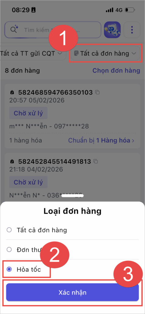 Tại màn hình Danh sách đơn hàng, anh chị chọn loại đơn Hỏa tốc, sau đó nhấn Xác nhận.