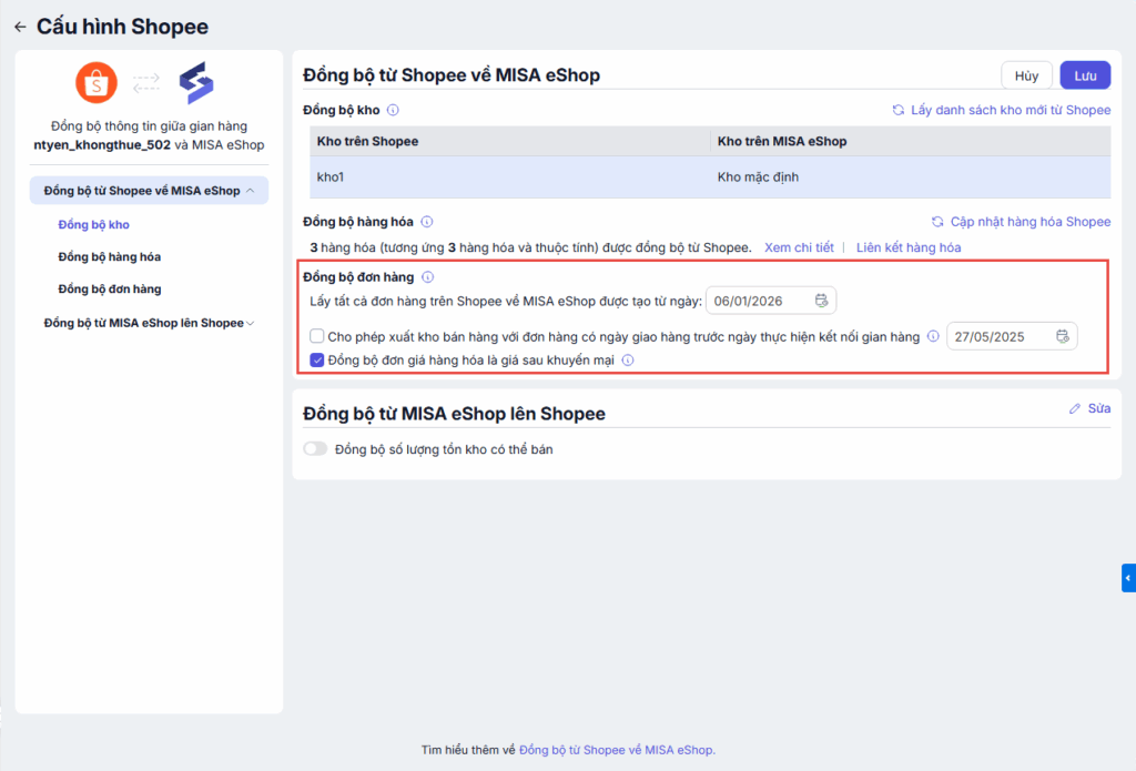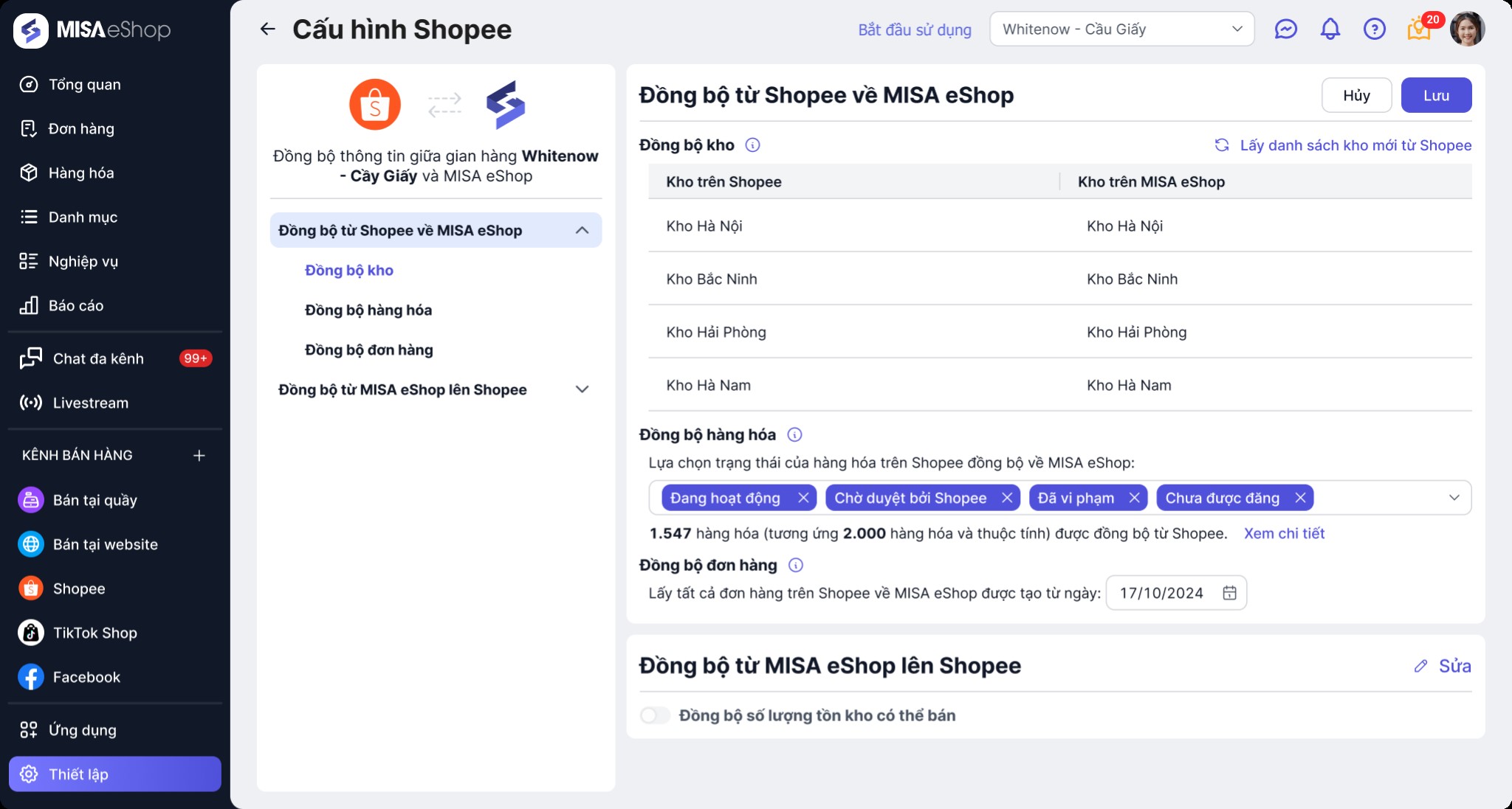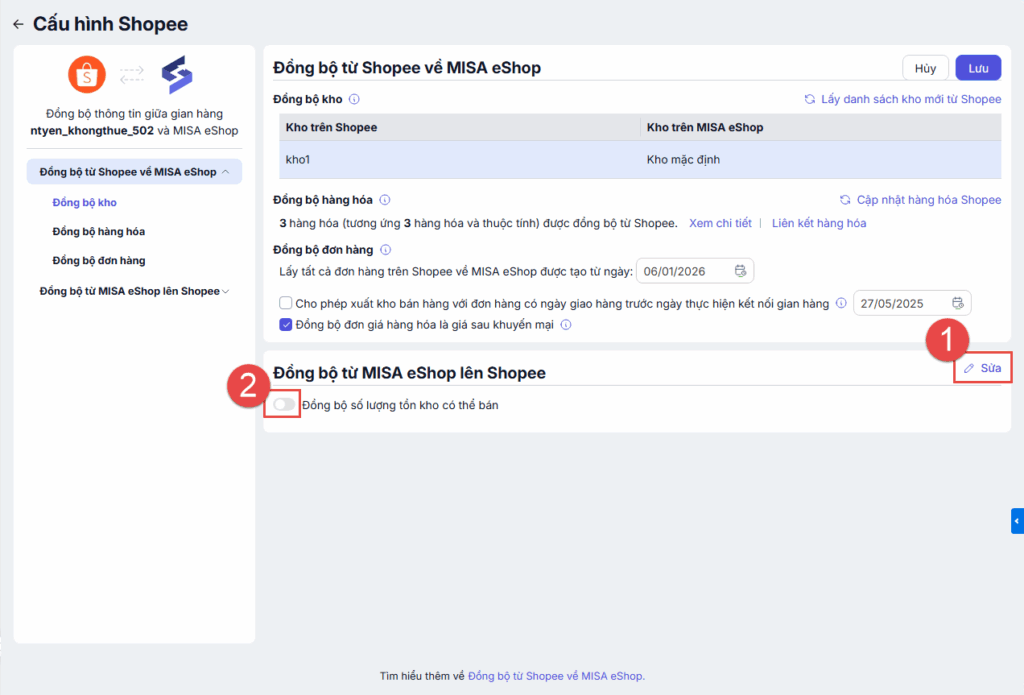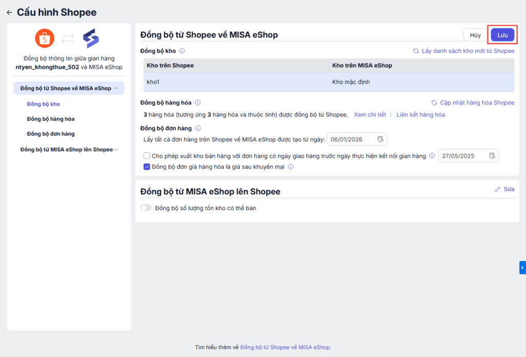 Sau khi kết nối thành công, anh chị thực hiện bước Đồng bộ dữ liệu từ Shopee gồm: Đồng bộ kho, hàng hóa, đơn hàng. Đồng bộ dữ liệu từ Misa eshop lên shopee gồm: Đồng bộ số lượng tồn kho có thể bán.