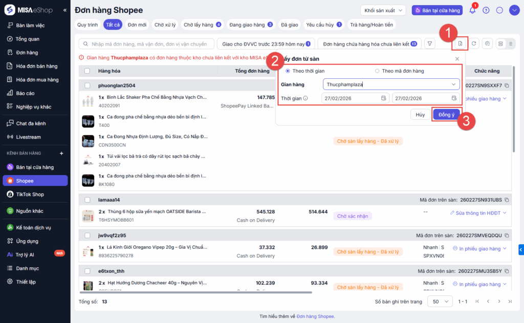 - Và nhấn Đồng ý -> Hệ thống tiến hành lấy đơn từ sàn về MISA eShop.