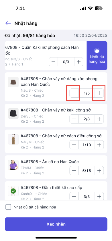 Thực hiện nhặt từng sản phẩm theo danh sách, sử dụng biểu tượng dấu cộng/trừ để điều chỉnh số lượng đã nhặt.