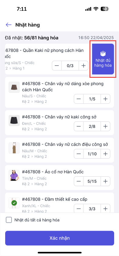 Khi đã nhặt đủ toàn bộ sản phẩm trong đơn, có thể tích chọn “Nhặt đủ tất cả hàng hóa” để hoàn tất.