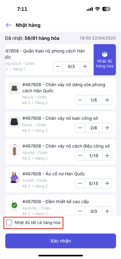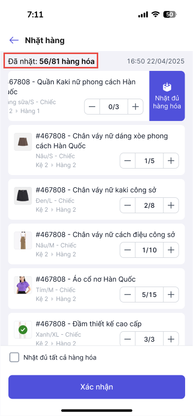 Nhấn Xác nhận để hoàn tất quy trình nhặt hàng.