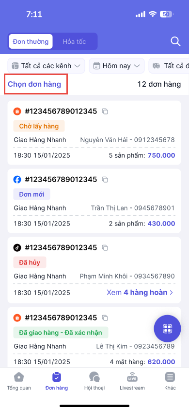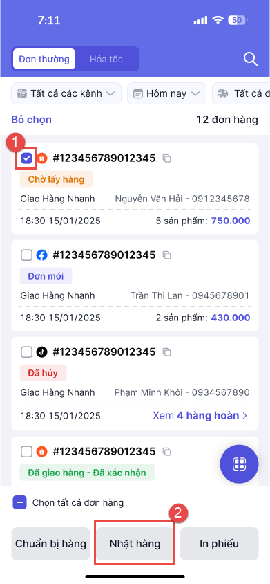 Chọn các đơn có trạng thái Chờ lấy hàng. Nhấn vào nút Nhặt hàng để bắt đầu quá trình chuẩn bị.
