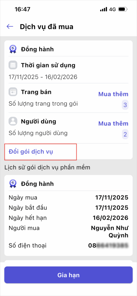 Bước 3: Trong giao diện chi tiết gói, chọn Đổi gói dịch vụ.