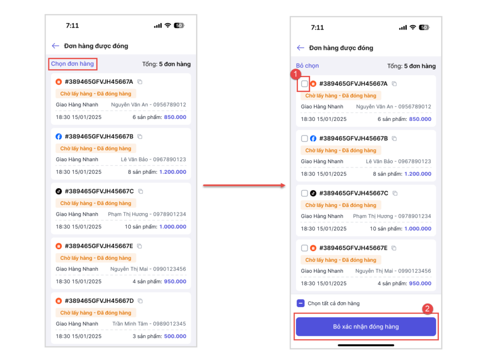 Chọn mục Chọn đơn hàng, tích chọn các đơn cần thao tác, sau đó nhấn Bỏ xác nhận đóng hàng.
