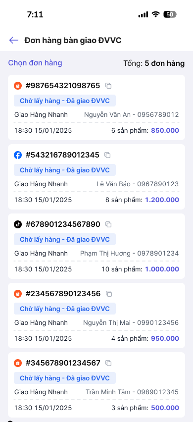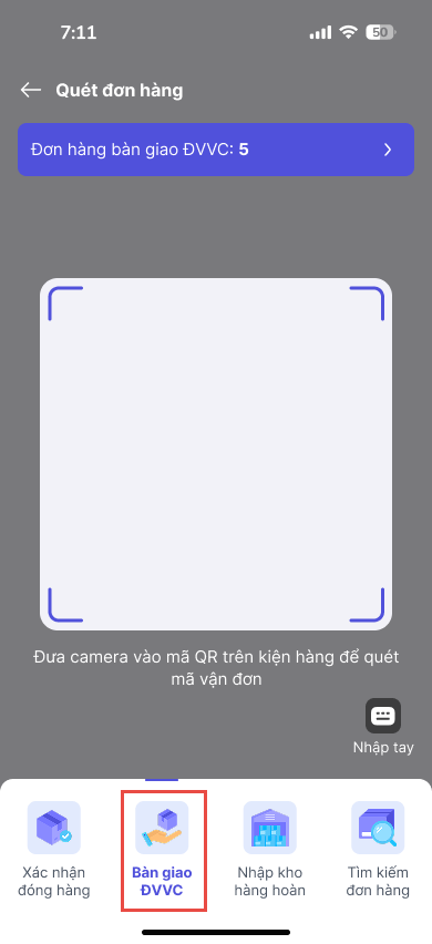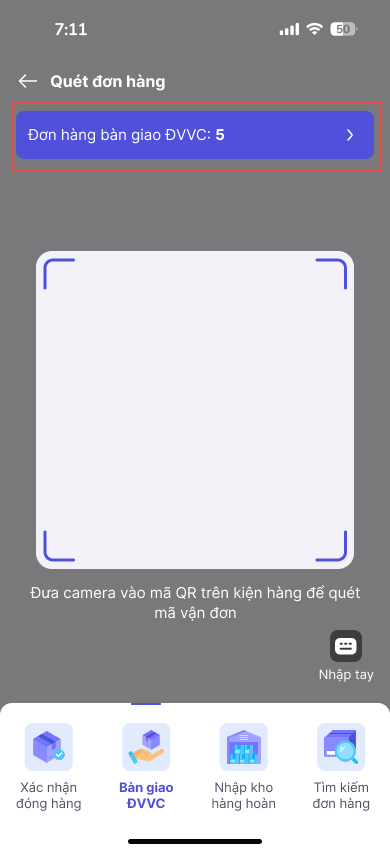 Tiến hành quét mã QR của các đơn hàng cần bàn giao. Hệ thống sẽ tự động ghi nhận và cập nhật số lượng đơn đã bàn giao.