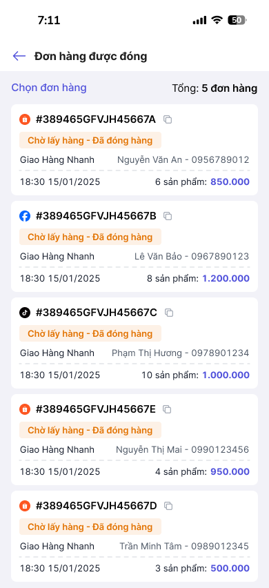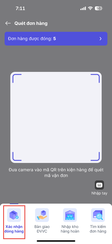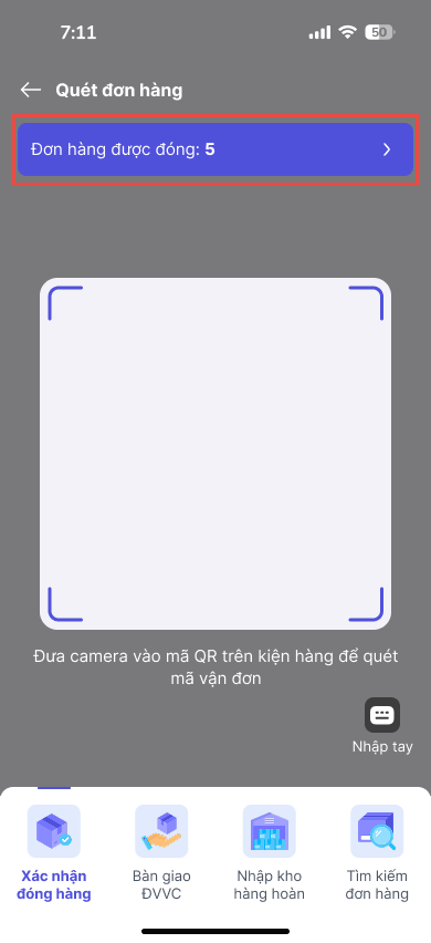 Thực hiện quét mã QR đơn hàng. Sau mỗi lần quét, hệ thống sẽ tự động cập nhật số lượng đơn hàng đã được đóng.