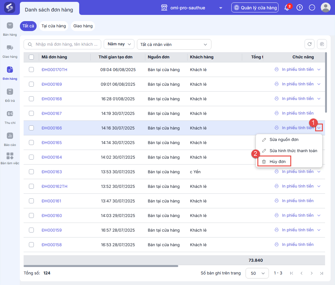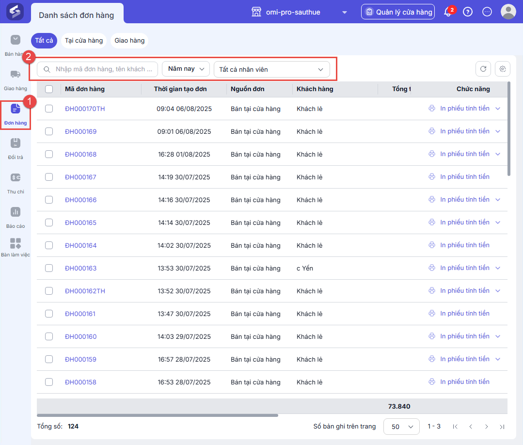 Tại kênh Bán tại cửa hàng, chọn Đơn hàng.