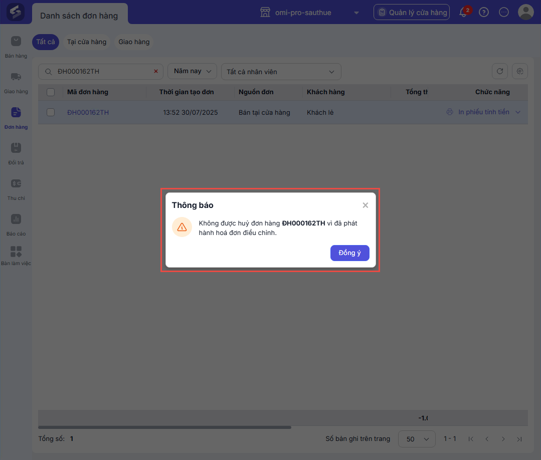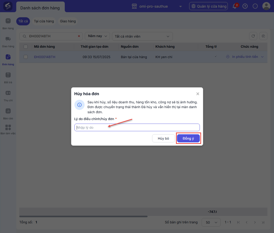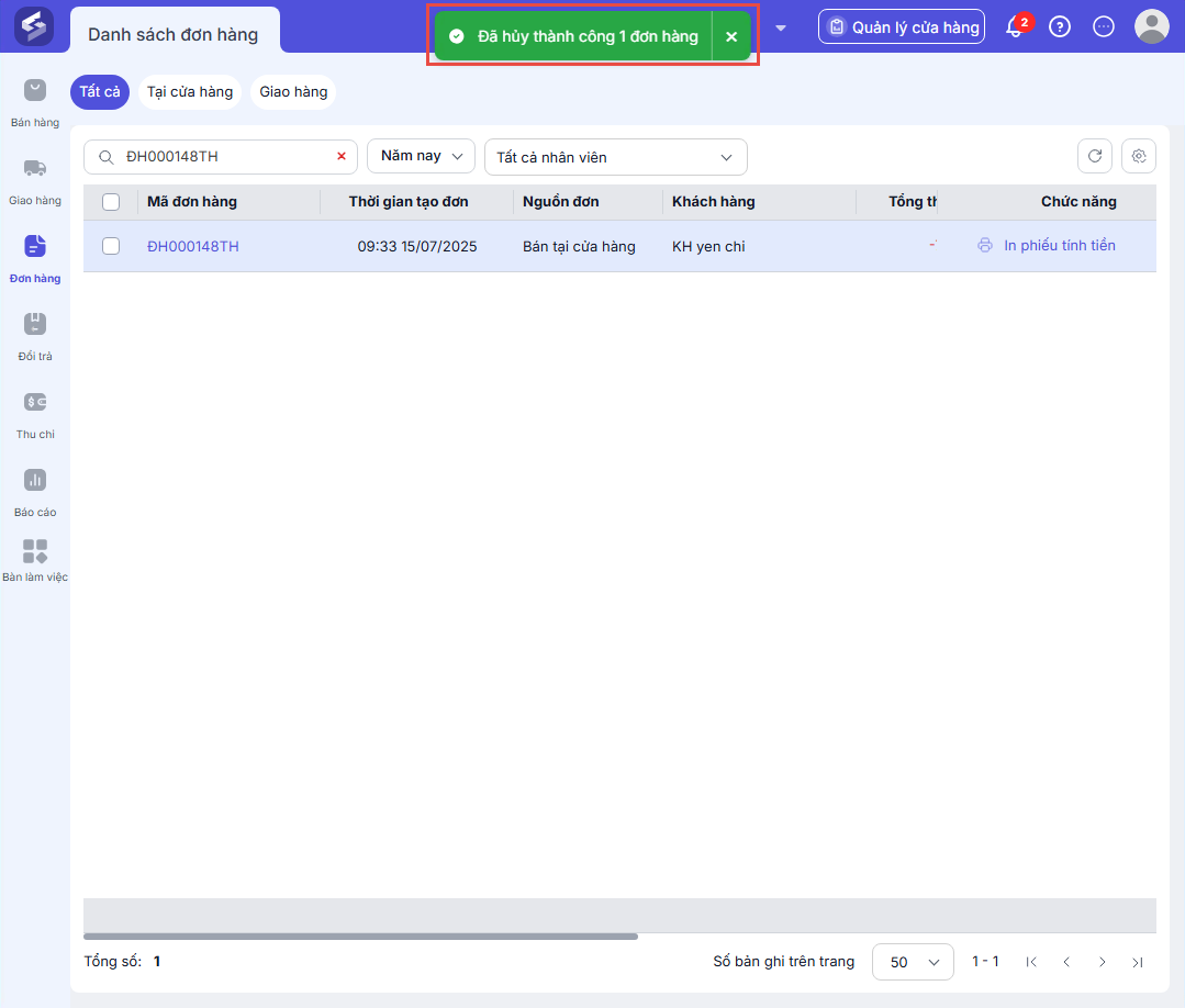 – Sau khi hoàn tất, hệ thống thông báo Hủy đơn hàng thành công.