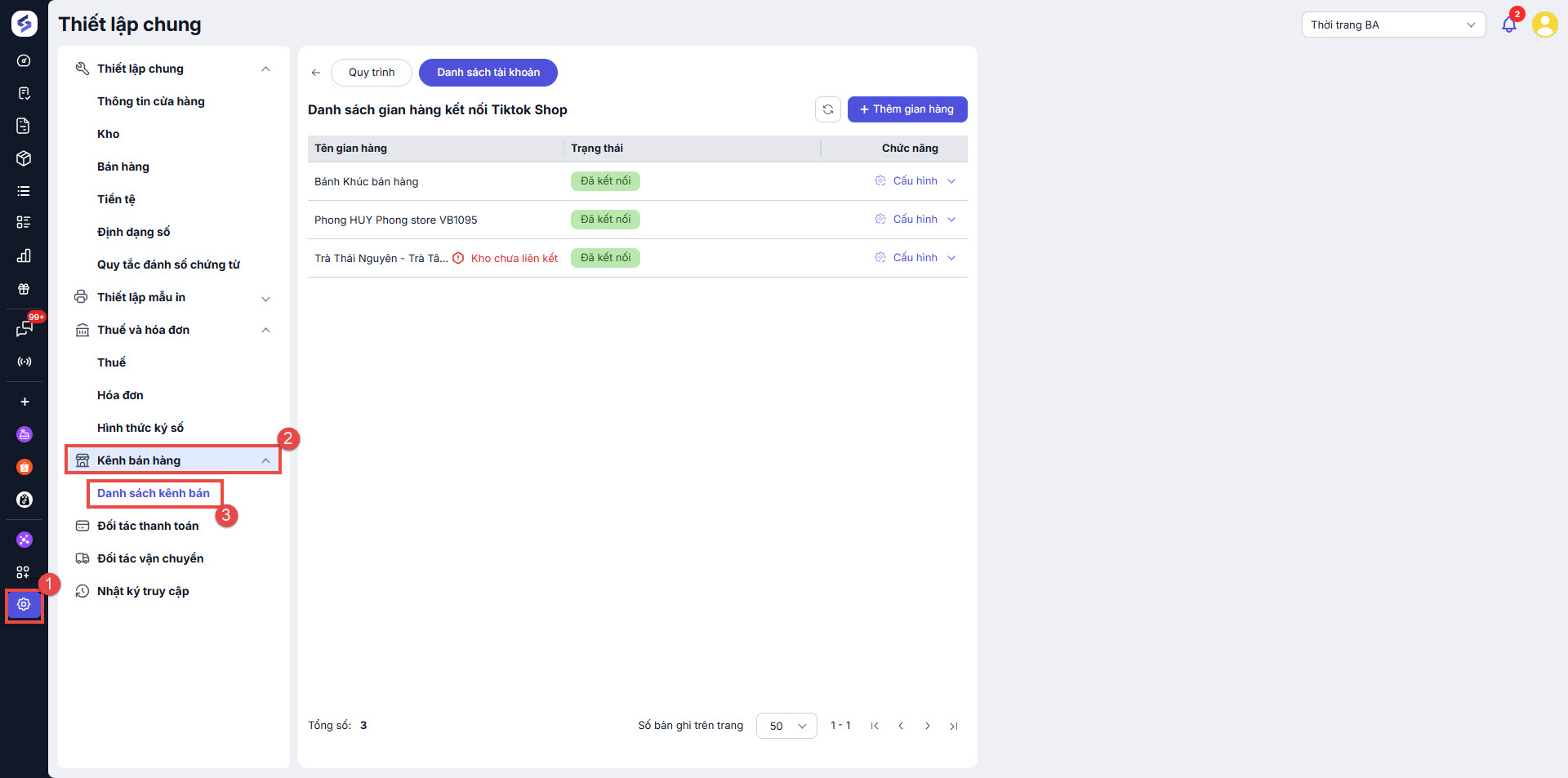 Vào Thiết lập → chọn Kênh bán hàng → chọn Danh sách kênh bán.