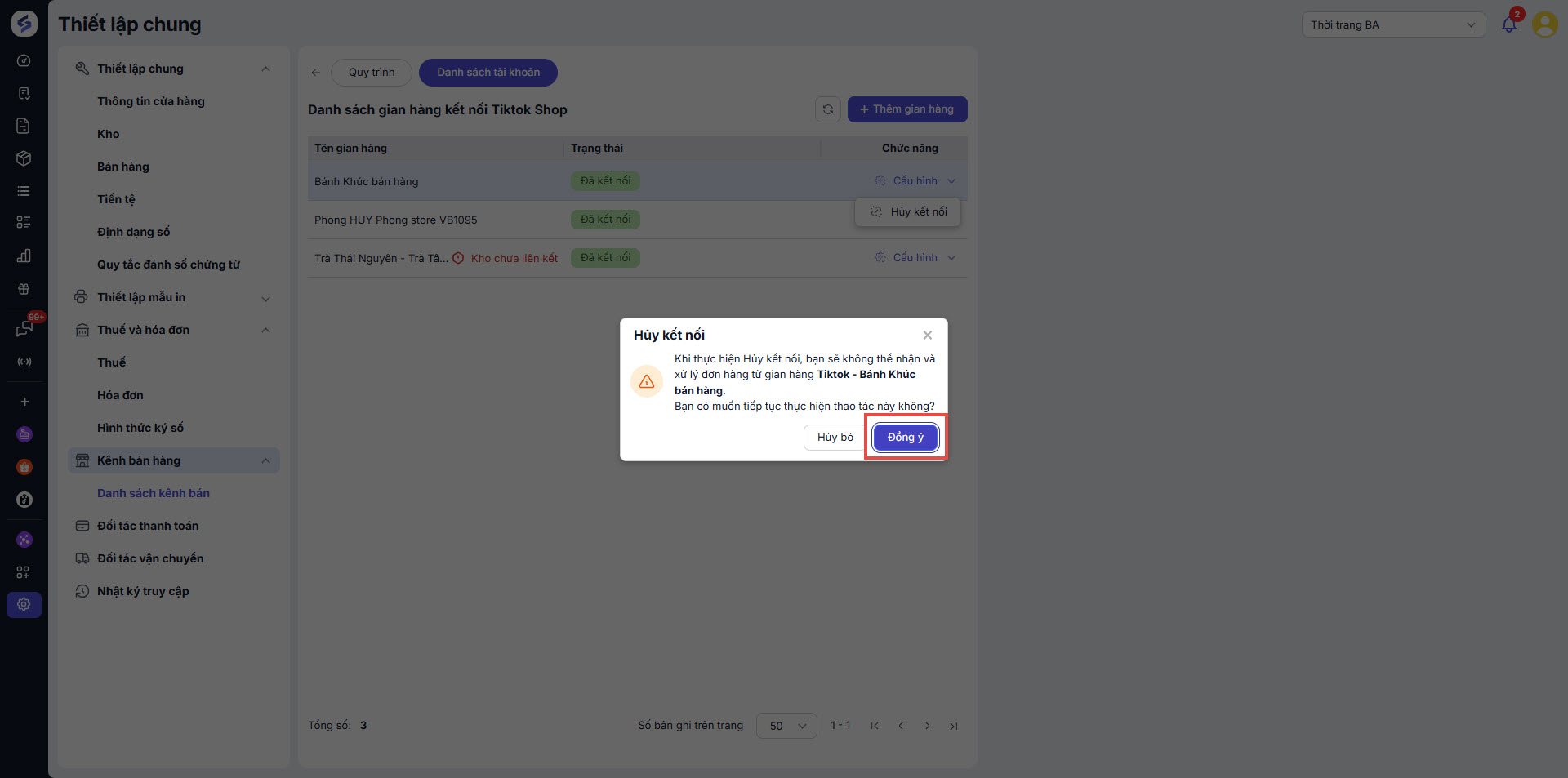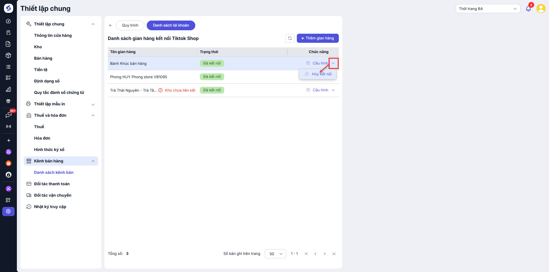 Bước 2. Chọn gian hàng TikTok Shop cần hủy kết nối