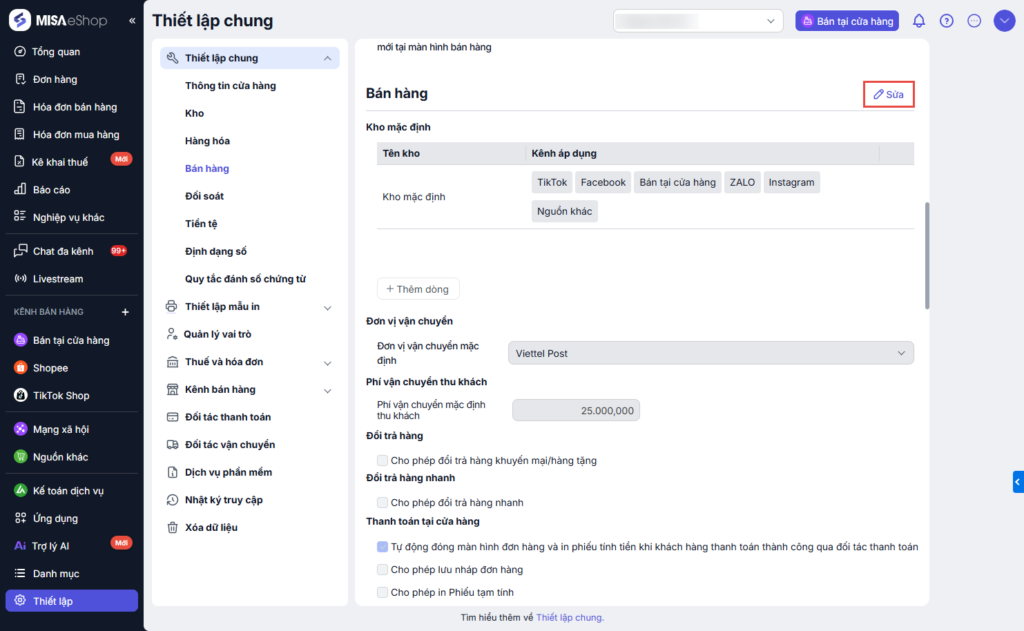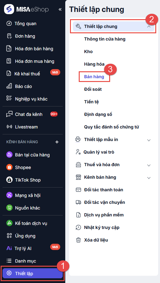 Tại màn quản lý, chọn Thiết lập\Thiết lập chung\Bán hàng.