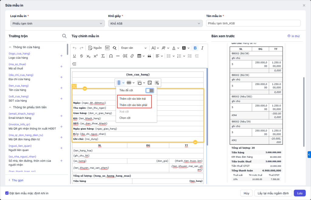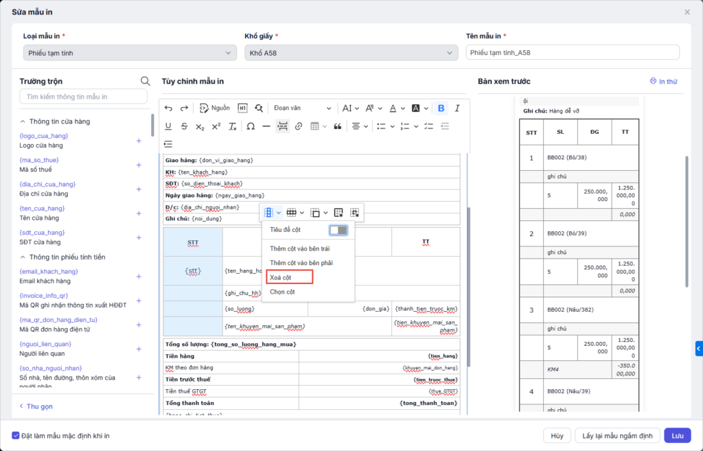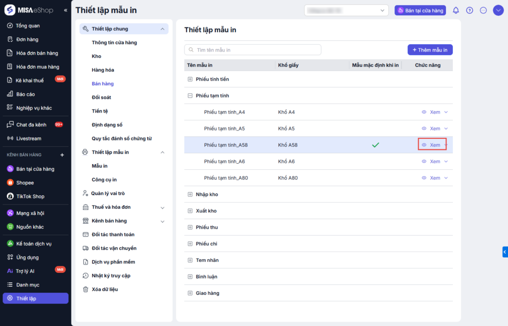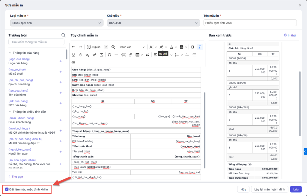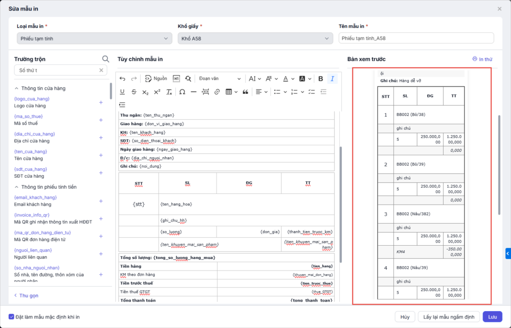 - Chọn mẫu in phiếu tạm tính phù hợp với khổ giấy, nhấn Xem để xem trước mẫu.