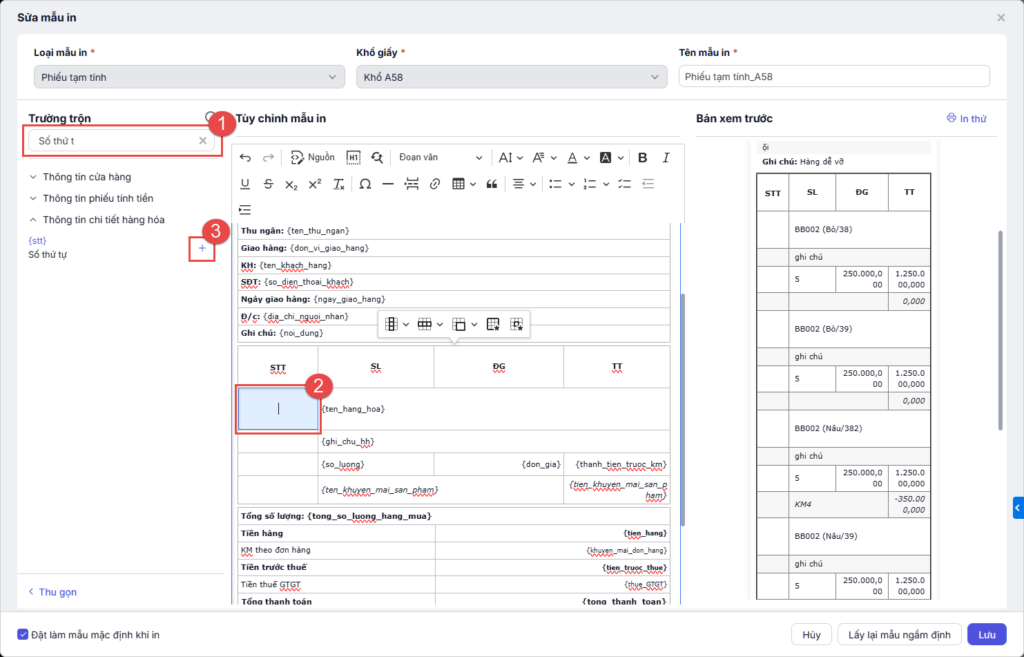 và tìm kiếm thông tin mẫu in. Nhấn vào vị trí cần thêm trường, nhấn vào biểu tượng dấu cộng để thêm, căn chỉnh lại cho phù hợp.
