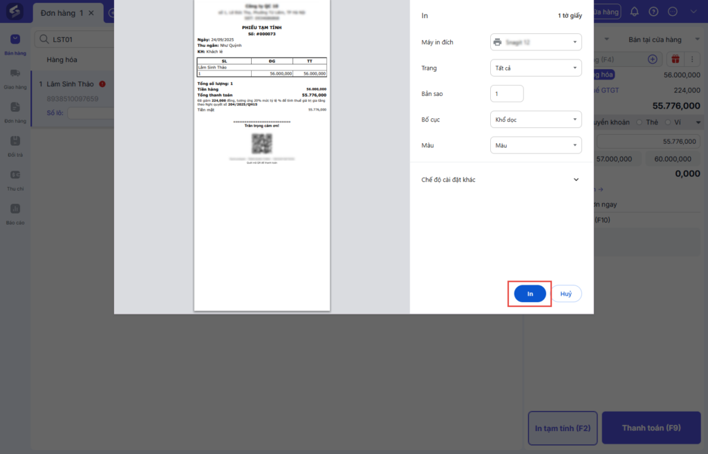 Sau khi nhập đầy đủ thông tin đơn hàng tại cửa hàng, nhấn In tạm tính.