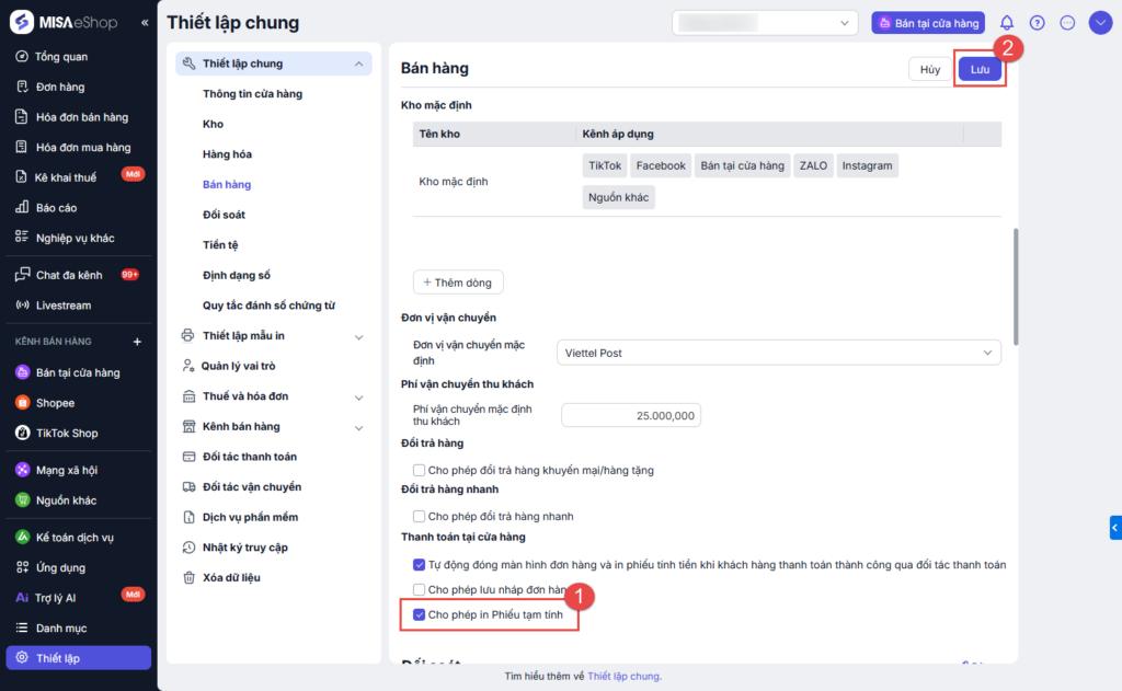 Tích chọn In tạm tính. Nhấn Lưu để hoàn tất.