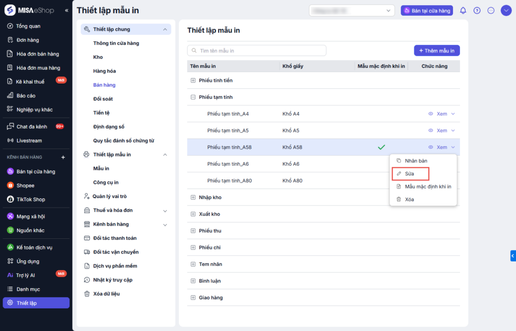Bước 1: Tại màn quản lý, chọn Thiết lập\Thiết lập mẫu in\Mẫu in.