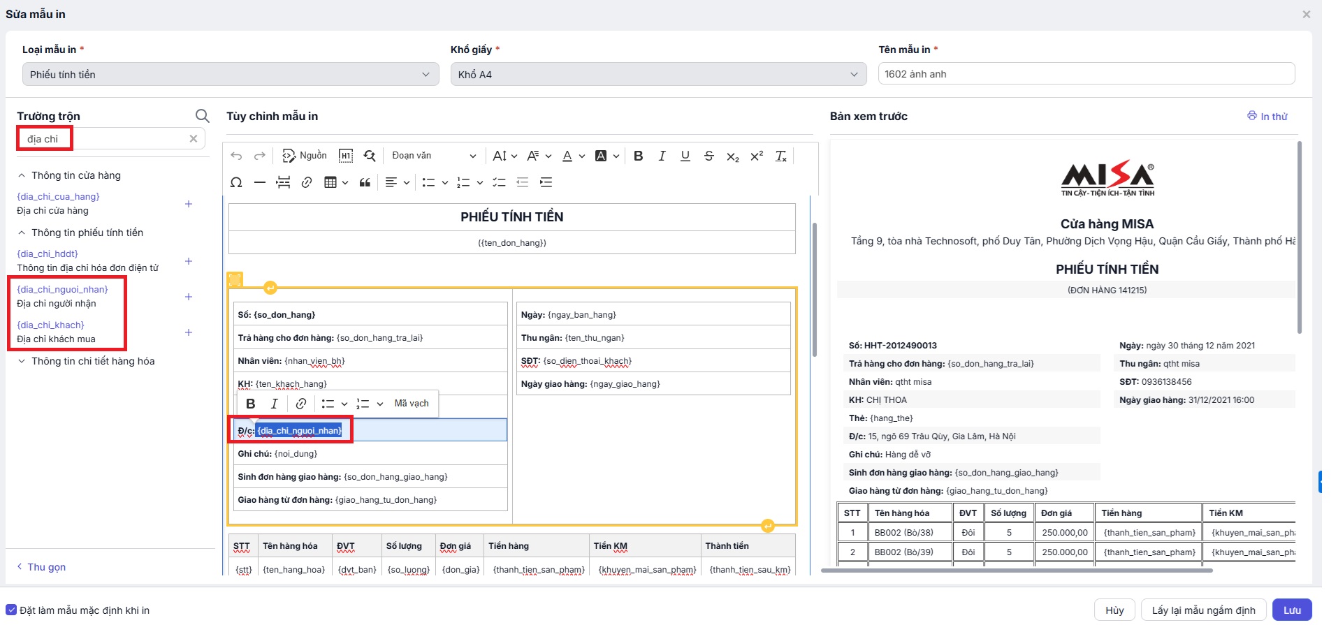 - Đối với trường địa chỉ của khách hàng – Mẫu mặc định phần mềm đang để Địa chỉ là Địa chỉ người nhận {dia_chi_nguoi_nhan}. Muốn hiển thị đúng địa chỉ khách hàng đã điền trong danh mục khách hàng, Anh/chị sửa mẫu, chọn lại trường trộn Địa chỉ khách mua {dia_chi_khach}.