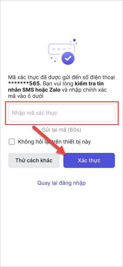 - Nhập mã xác thực được gửi về số điện thoại đã đăng ký.