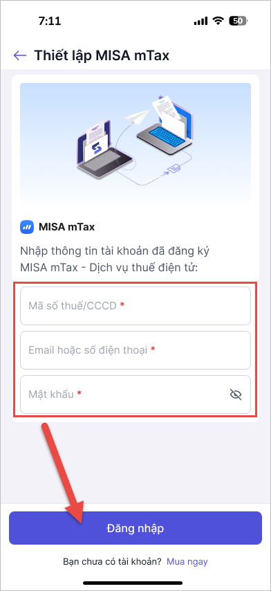 Lưu ý: Trường hợp chưa có tài khoản mTax, nhấn Mua ngay để thực hiện mua và đăng ký tài khoản.