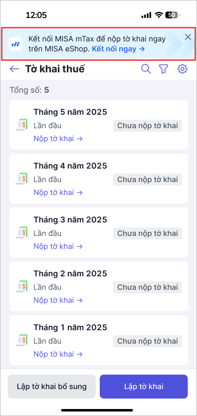 - Trường hợp 1: Khi thực hiện kê khai thuế mà chưa kết nối với mTax, phần mềm sẽ hiển thị nhắc nhở Kết nối mTax.