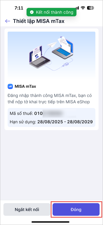 Sau khi xác thực thành công, phần mềm báo đăng ký kết nối thành công với mTax → Nhấn Đóng để bắt đầu quá trình nộp tờ khai.