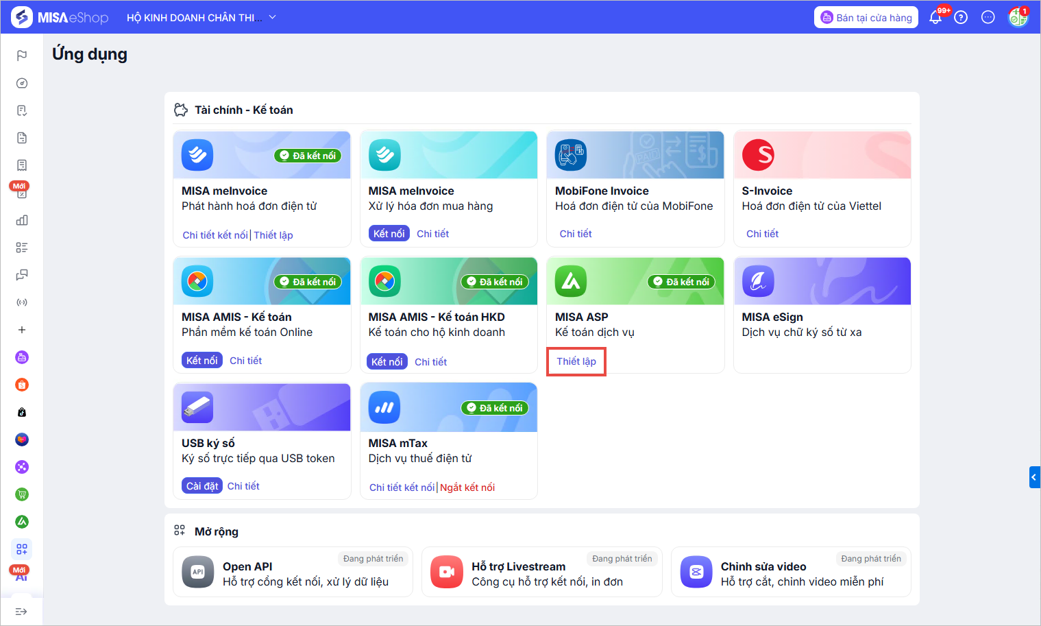 Sau khi đã thực hiện kết nối tại MISA ASP, tại MISA eShop, hệ thống chuyển sang trạng thái Thiết lập.