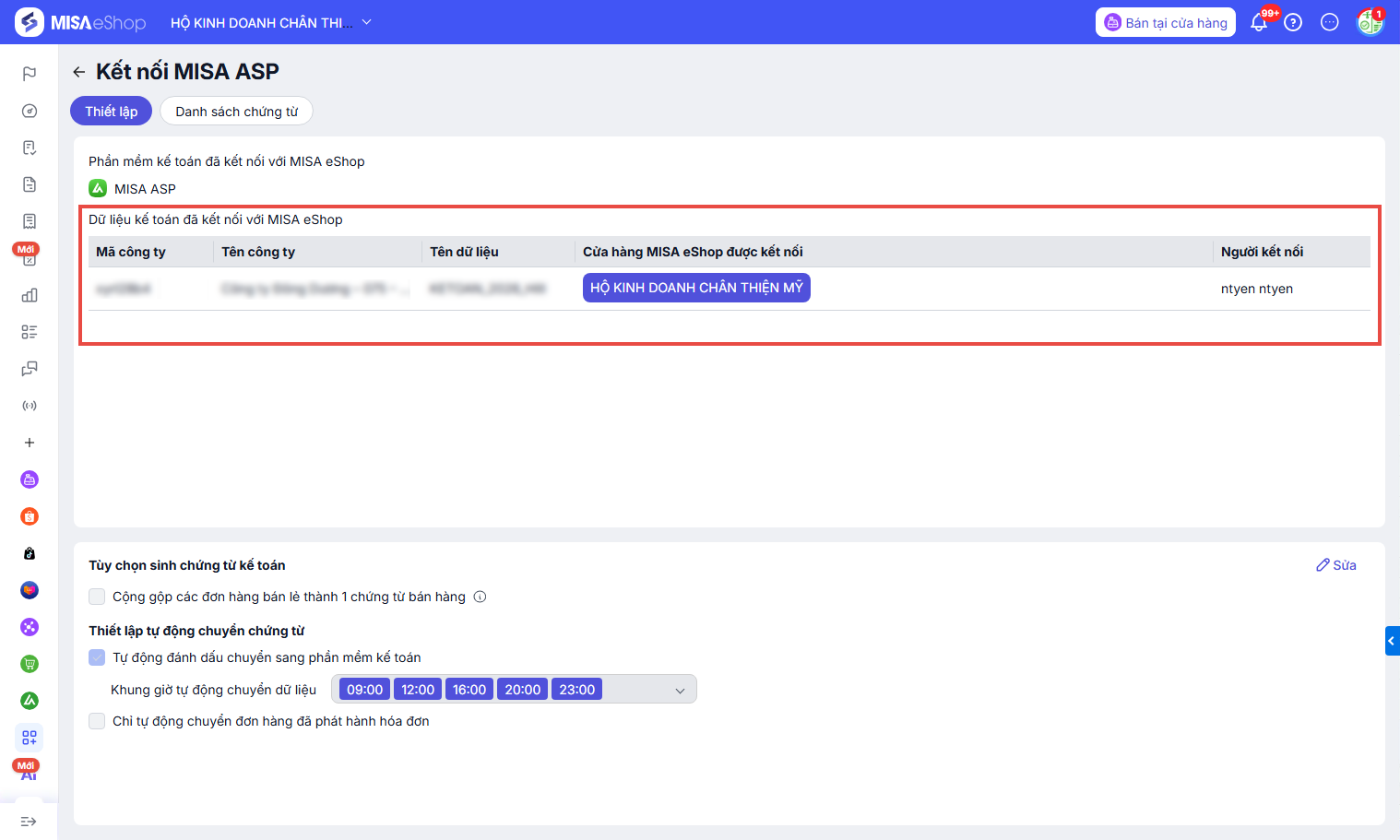 - Phần mềm hiển thị danh sách các dữ liệu kế toán đã kết nối với MISA eShop.