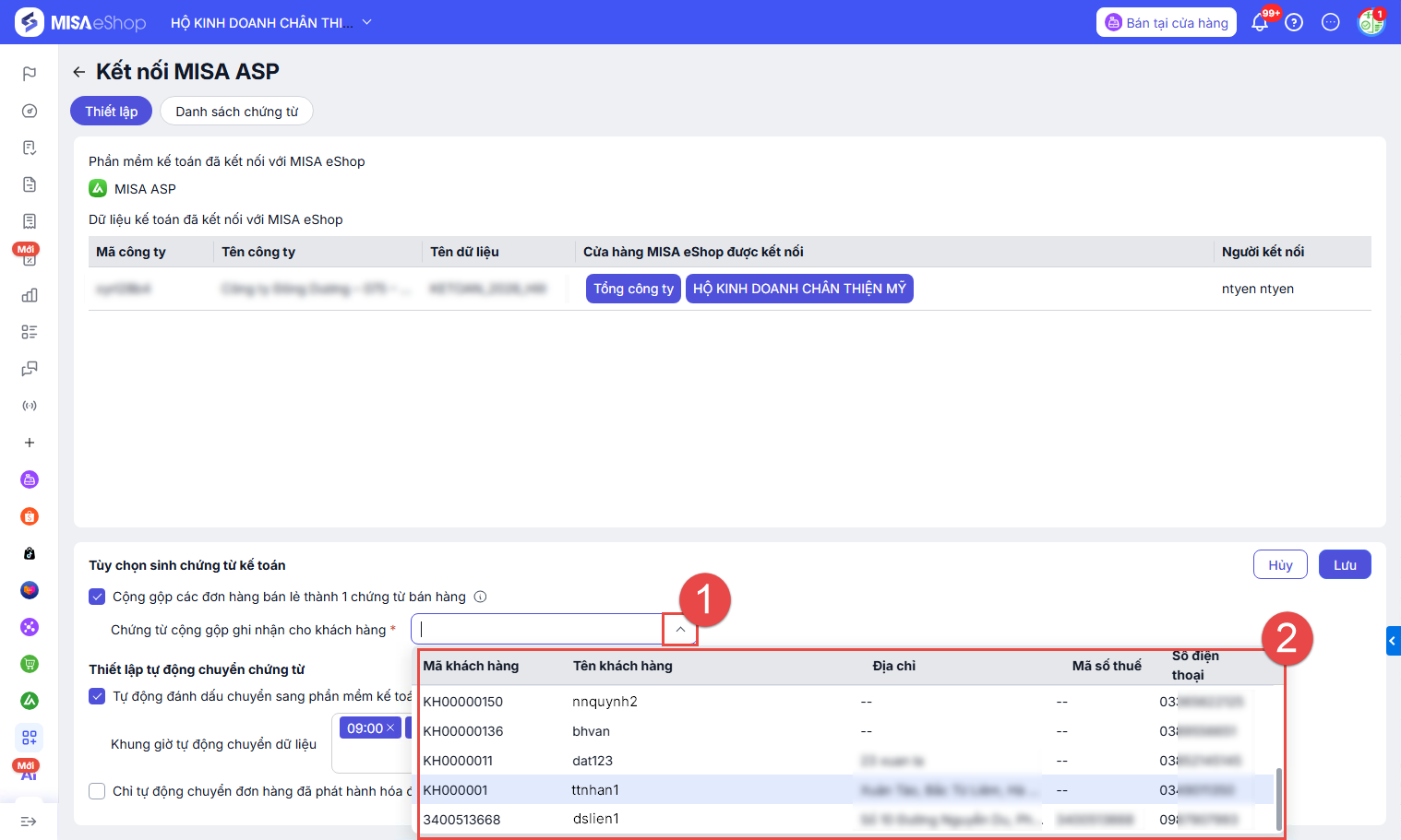 - Chứng từ cộng gộp ghi nhận cho khách hàng: Chọn 1 khách hàng thuộc danh sách khách hàng -> Sau khi lưu thiết lập, các chứng từ sẽ đứng tên khách hàng đã chọn.