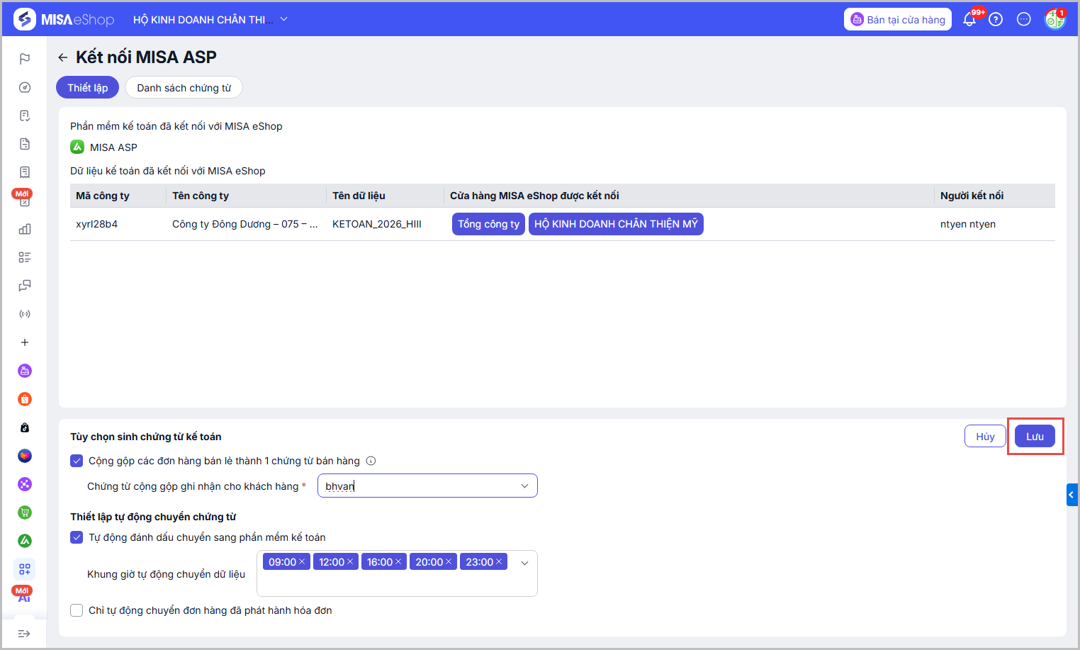 -> Khi đến giờ, hệ thống sẽ tự động kiểm tra các chứng từ hợp lệ và tiến hành chuyển sang phần mềm MISA ASP.
