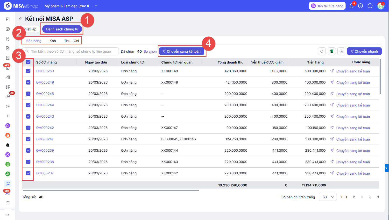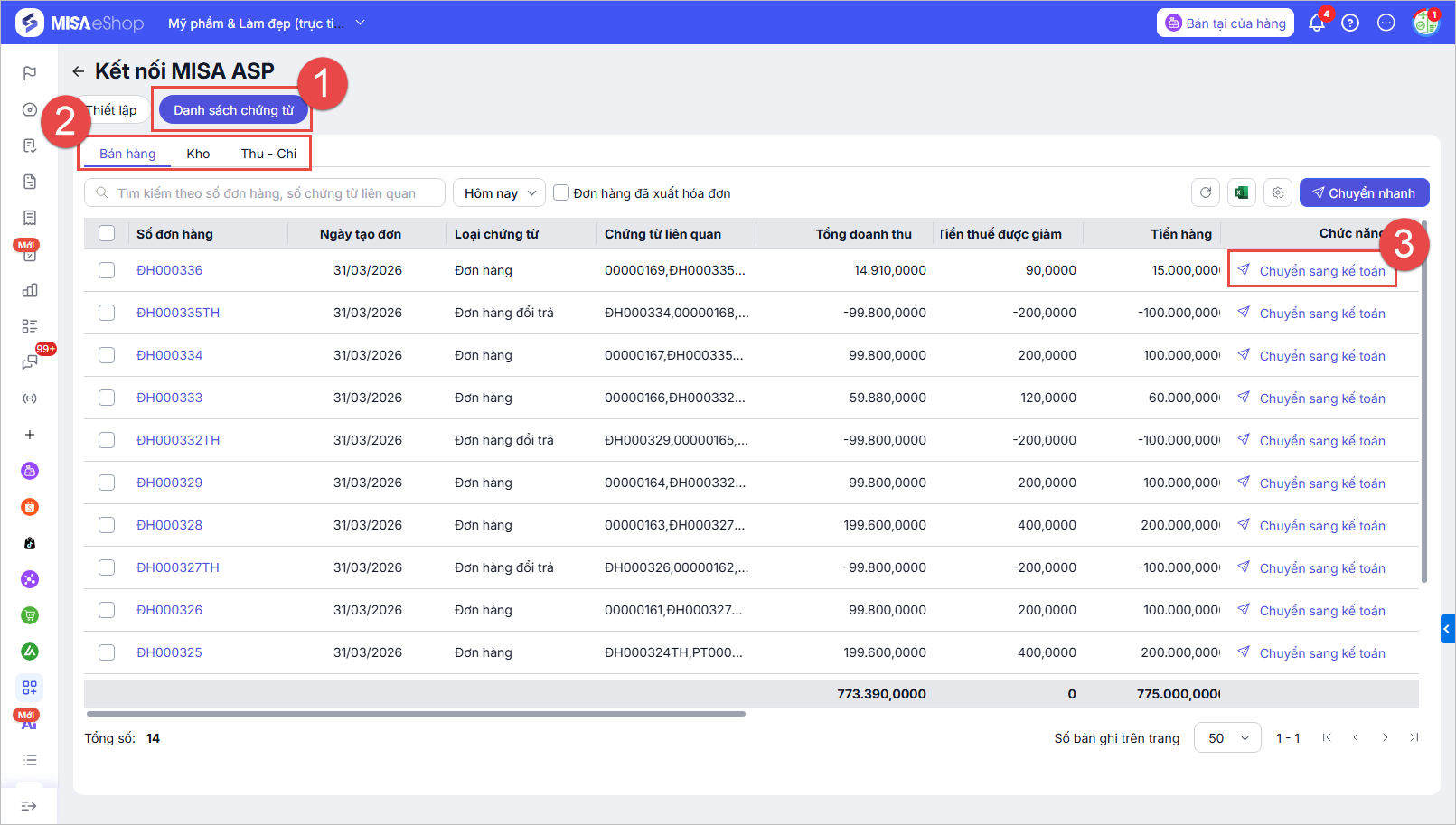 - Truy cập sanh sách chứng từ Bán hàng, Kho hoặc Thu – chi cần chuyển.
