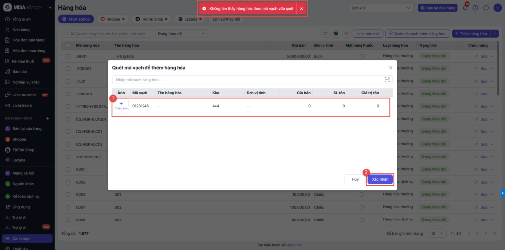 Nếu sản phẩm chưa có trong danh mục, phần mềm sẽ thông báo “Không tìm thấy hàng hóa qua mã vạch vừa quét”.