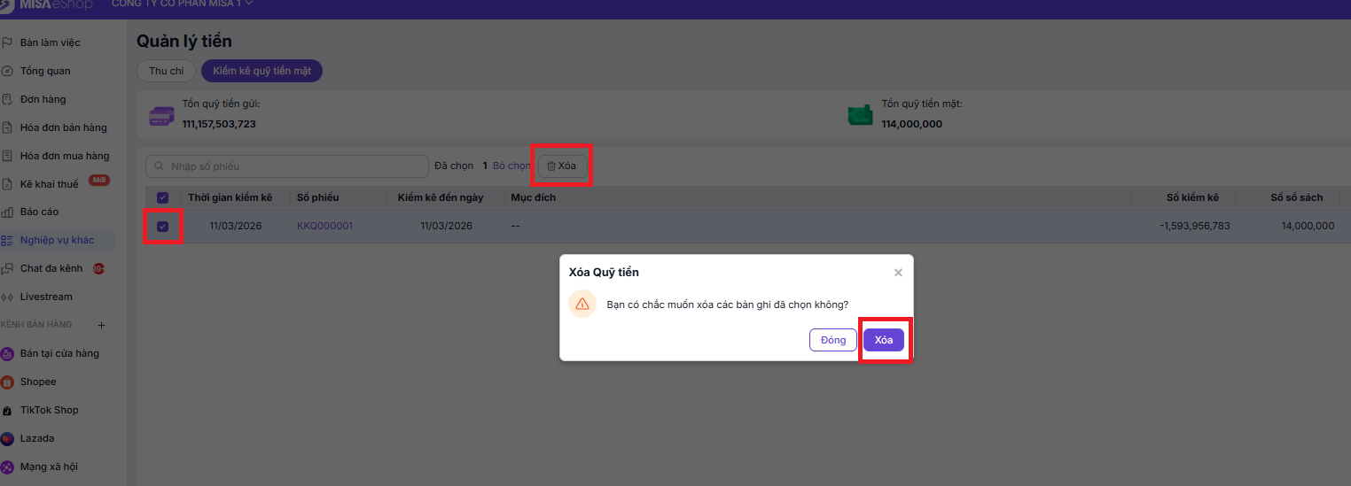 • Số kiểm kê: Số tiền thực tế kiểm tra trong quỹ tiền mặt