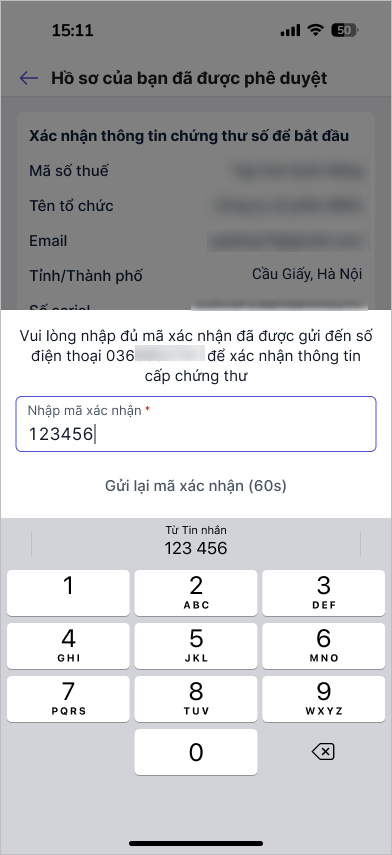 • Nhập mã OTP được gửi về tin nhắn SMS để xác thực và tiếp tục quá trình.