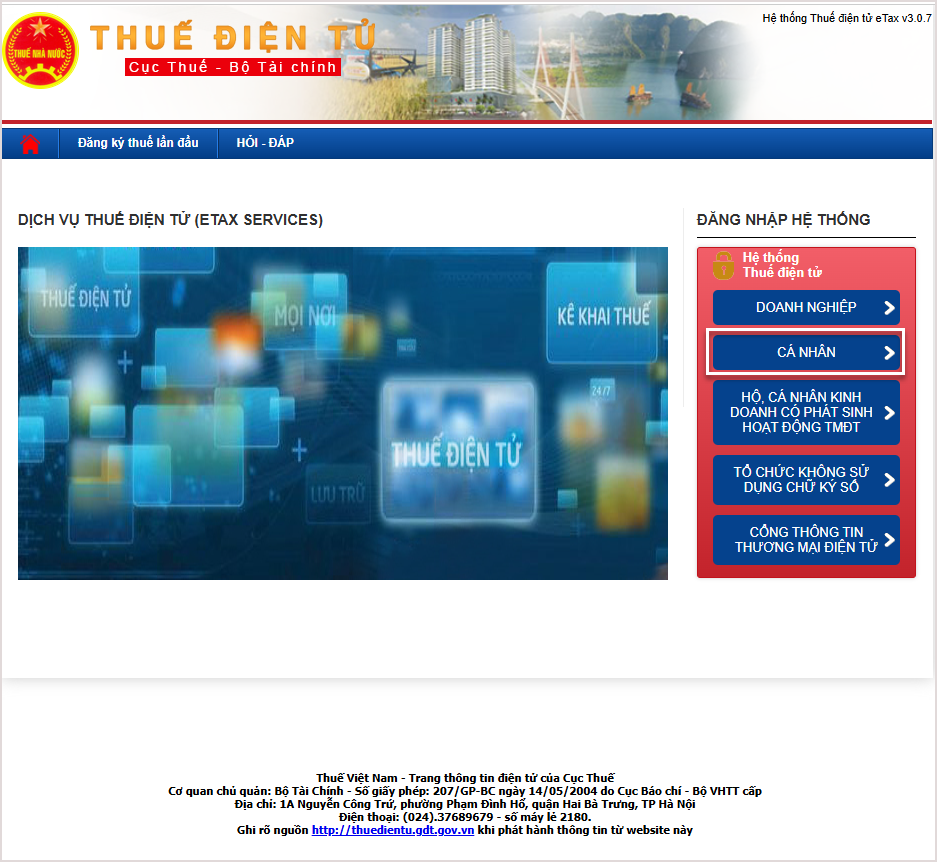 - Sau khi chọn mục Cá Nhân, hệ thống sẽ tự động điều hướng về website https://canhan.gdt.gov.vn/