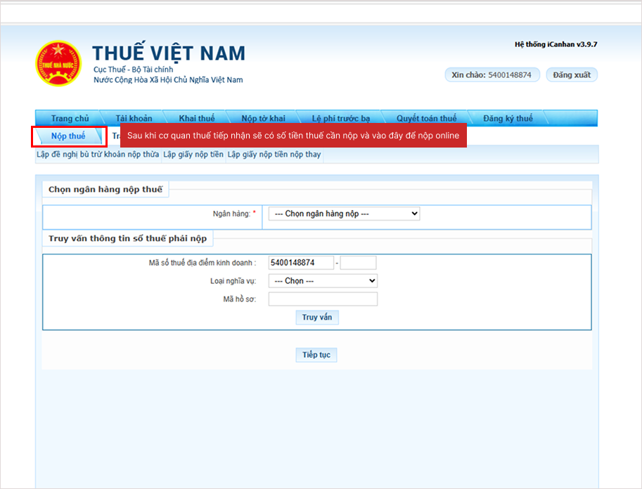 - Nhấn vào tab Nộp thuế để thực hiện nộp online.