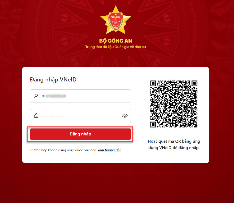 - Nhập số CCCD và mật khẩu để đăng nhập (Hoặc quét mã QR bằng ứng dụng VNeID).