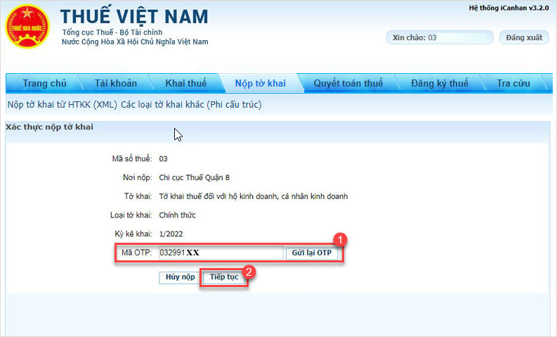 - Nhập mã OTP được Tổng Cục Thuế gửi vào số điện thoại đã đăng ký nộp tờ khai thuế điện tử.