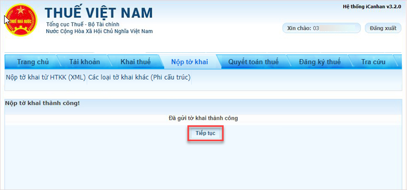 - Nhấn Tiếp tục để kiểm tra tình trạng nộp tờ khai.