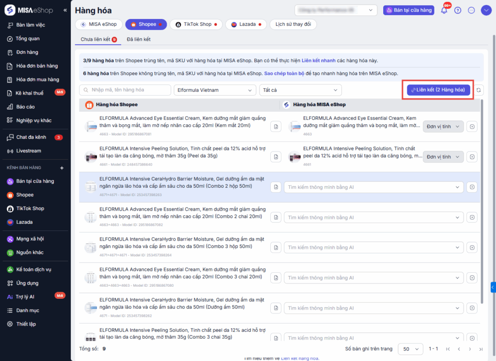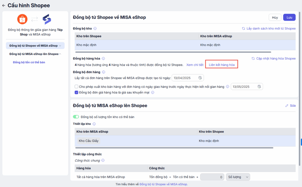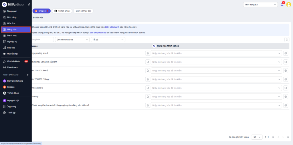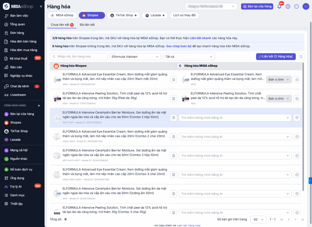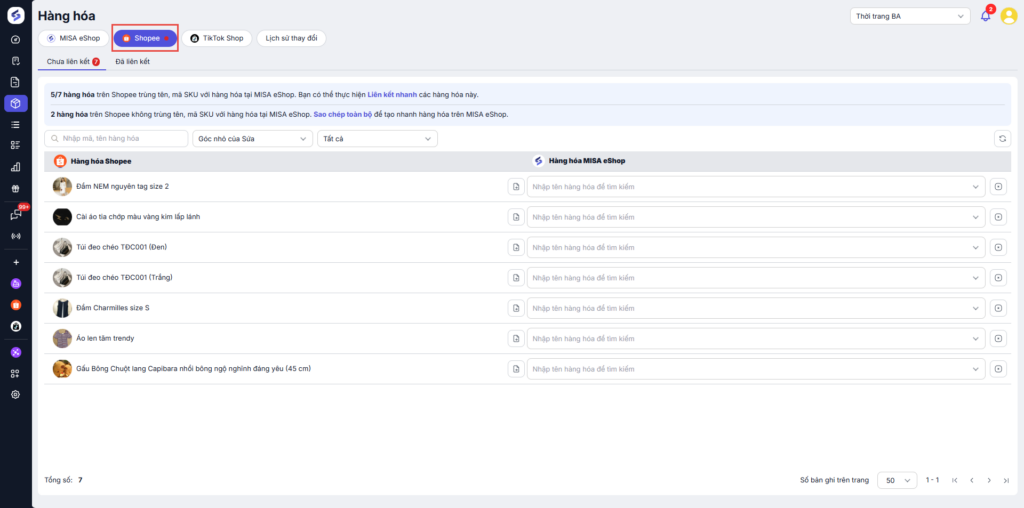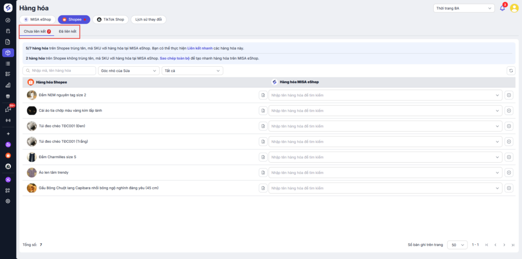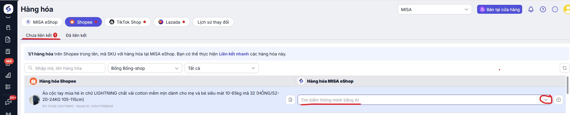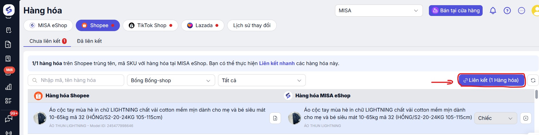 • Thực hiện liên kết hàng hóa khi hàng hóa trên Shopee trùng tên, mã SKU với hàng hóa tại MISA eShop