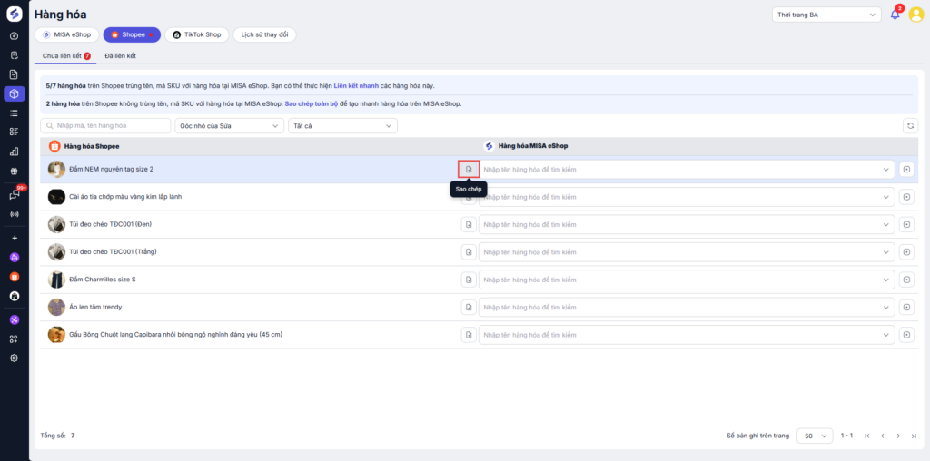 • Thực hiện sao chép hàng hóa khi hàng hóa trên Shopee không trùng tên, mã SKU với hàng hóa tại MISA eShop.
