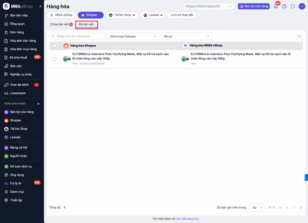 Chuyển sang tab Đã liên kết để kiểm tra toàn bộ danh sách sản phẩm đã được ghép nối thành công giữa Shopee và MISA eShop.