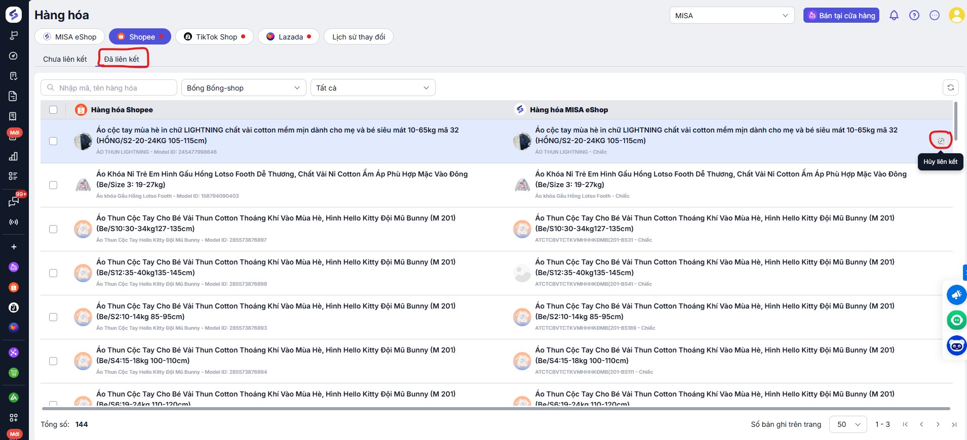 • Đã liên kết: là những sản phẩm đã được ghép đúng với hàng hóa trên MISA eShop.