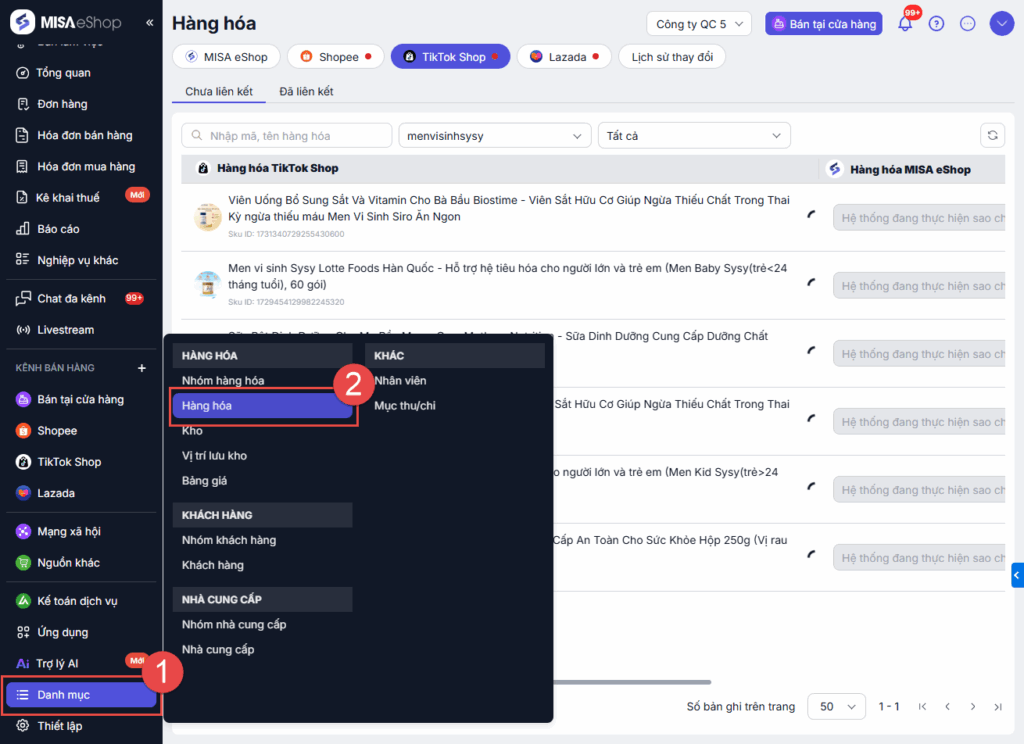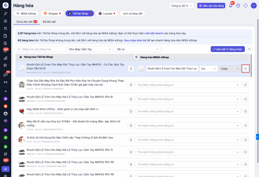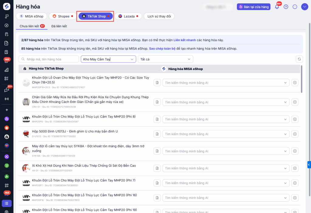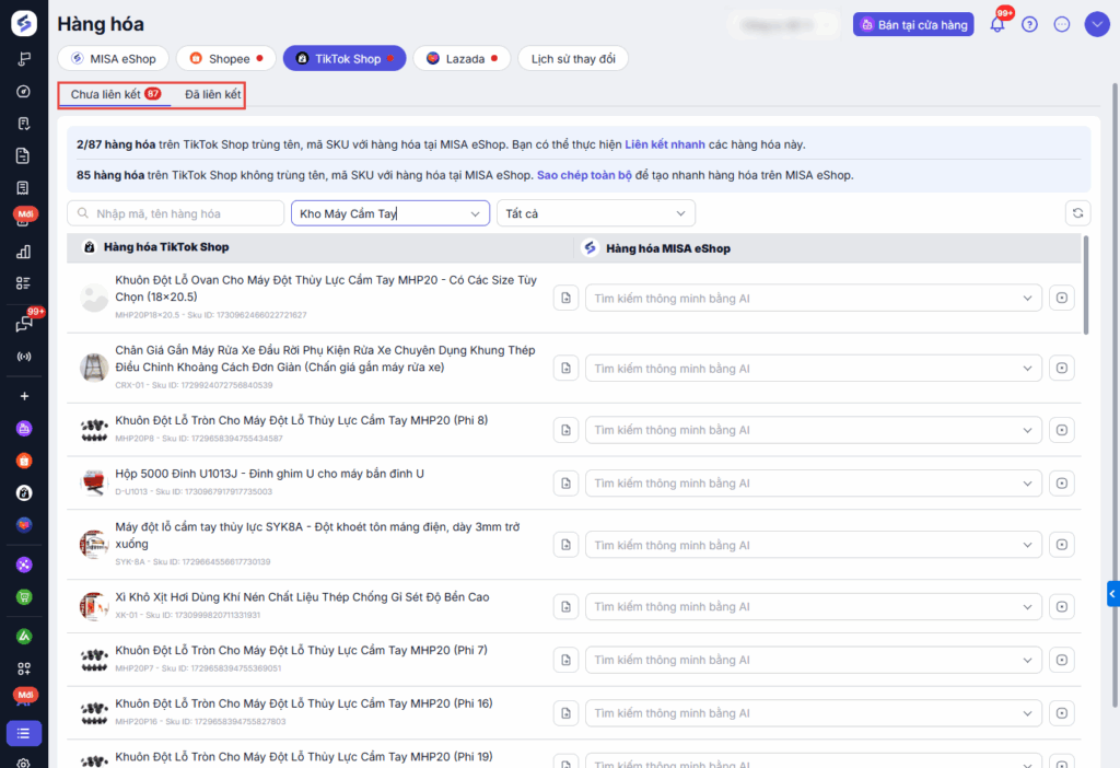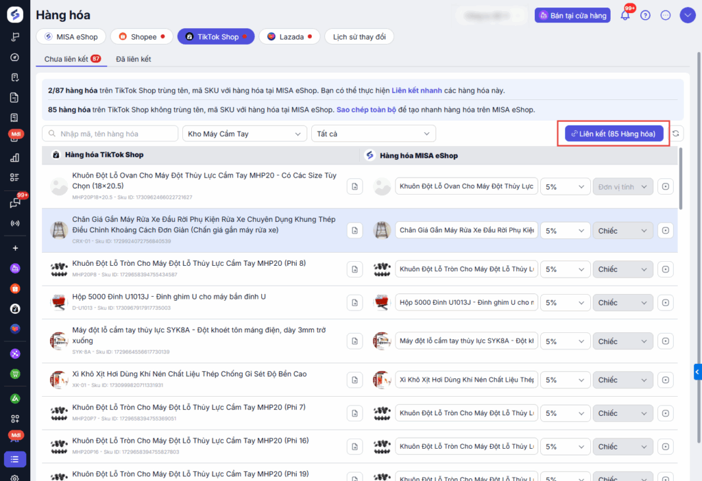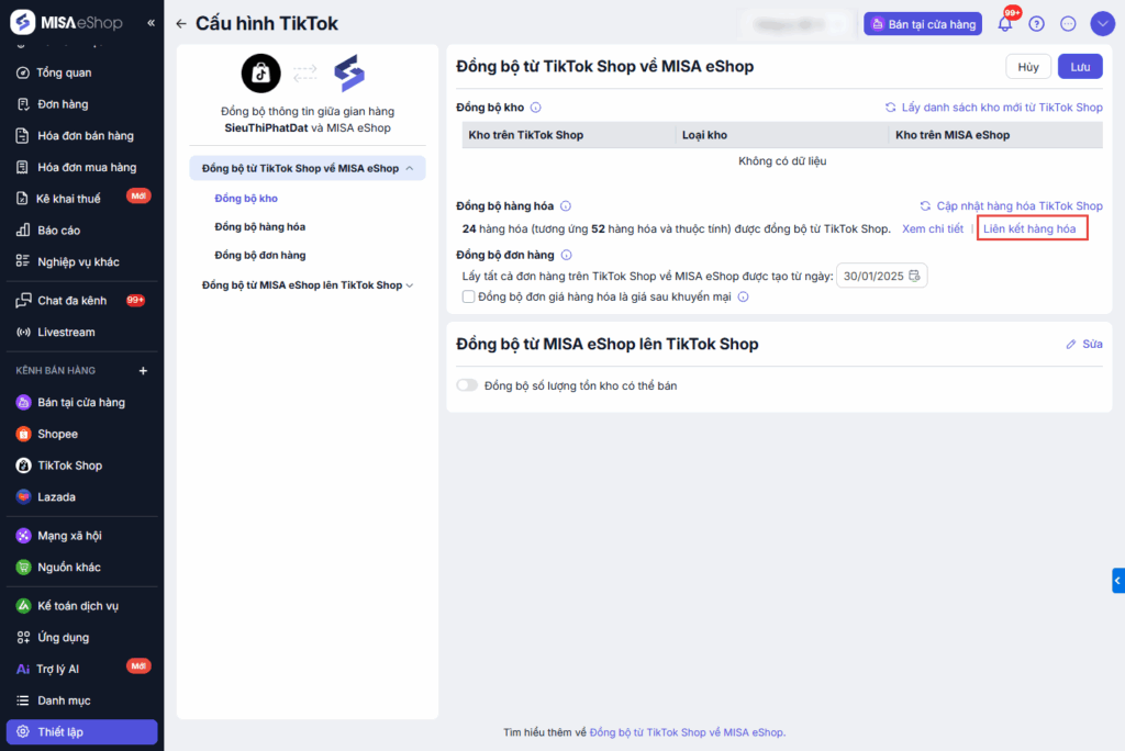 - Thực hiện liên kết hàng hóa khi hàng hóa trên Tiktok Shop trùng tên, mã SKU với hàng hóa tại MISA eShop